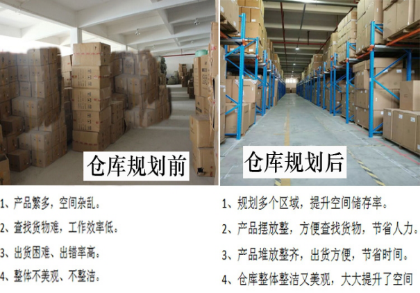 4、货物可以先存后取。移动叉车直接驶入货架通廊的正前方,提升货叉至牛搁梁上方的适当位置,再驶入通廊内叉取货物,叉取提升货物后再退出货架通廊,降下货物至安全高度。也可以在通廊货架两侧各设一条通道,一侧存入,一侧取出,适于储存少品种大批量同类型货物。